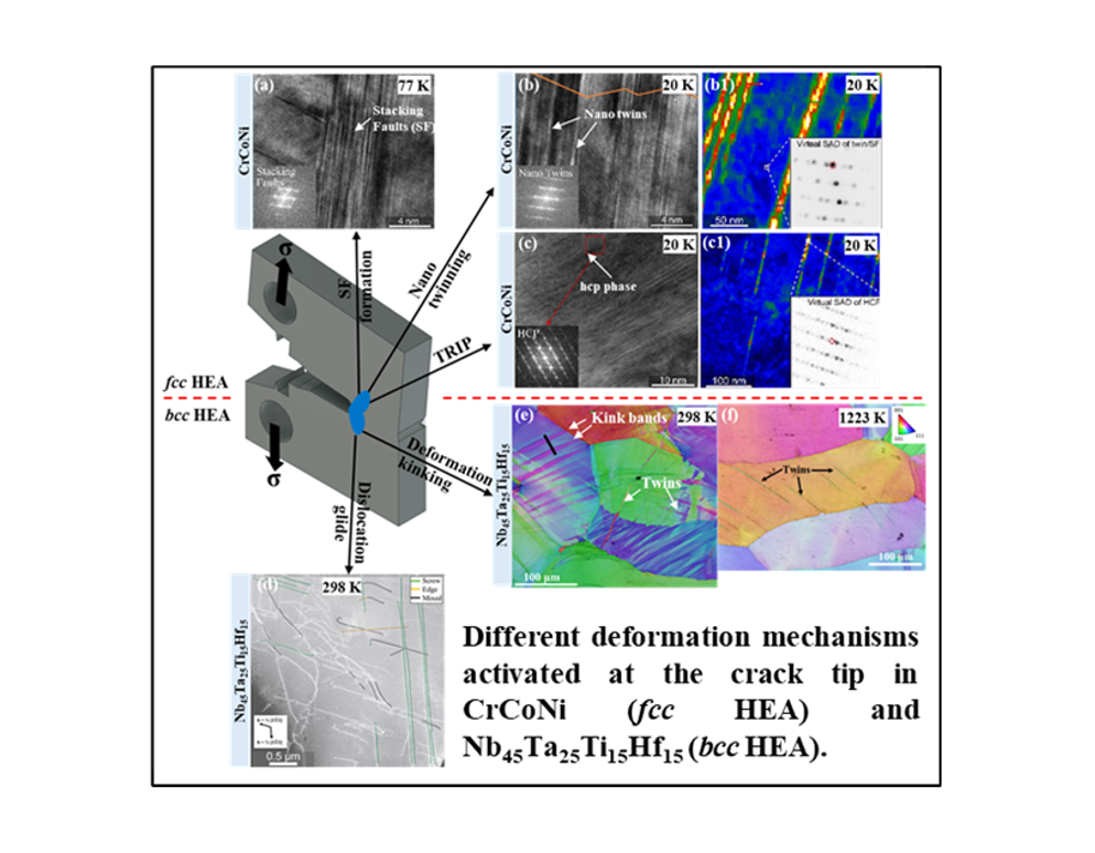 - Dislocation dissociation, transformation and twinning are induced in CrCoNi at cryogenic temperatures, whereas screw dislocations, twinning and kinking form in Nb₄₅Ta₂₅Ti₁₅Hf₁₅ at 77 to 1473 K. All mechanisms markedly that impart very high strength, toughness and damage tolerance