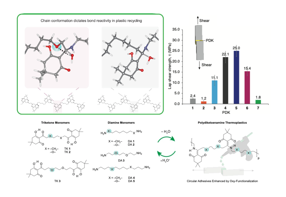 - Researchers in the CUP program found that targeted oxy-functionalization increased acidolysis rates and allowed for efficient deconstruction of linear polydiketoenamine (PDK) chains, imparting chemical recyclability on linear PDK thermoplastics and demonstrating the effects of in-chain functionalities on deconstruction rates